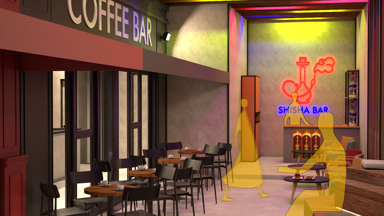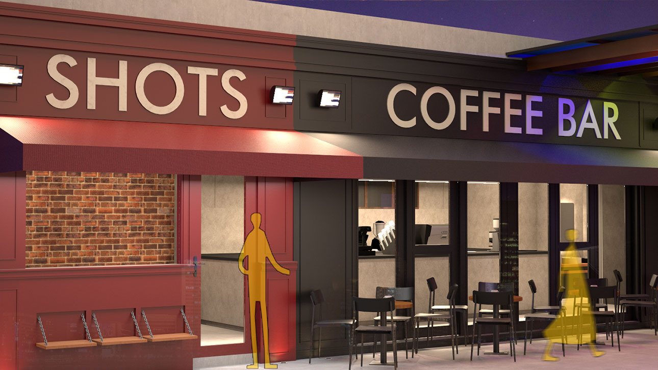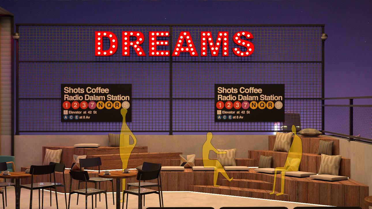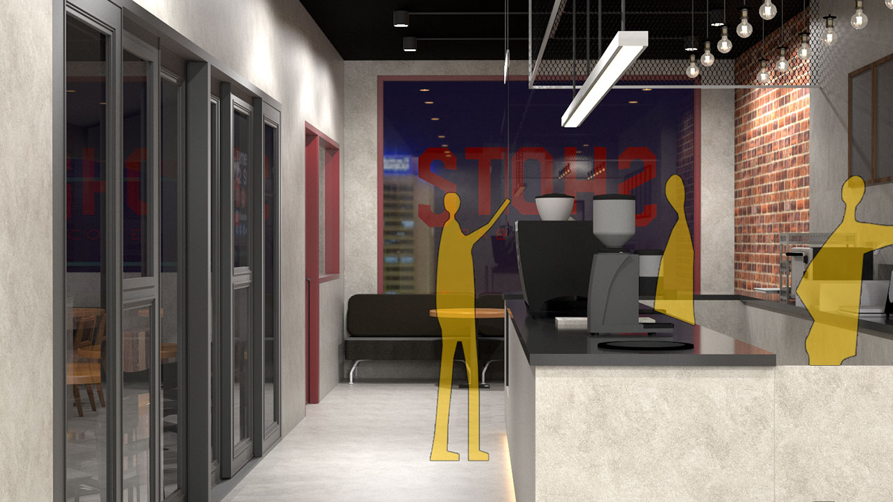 Shots Coffeebar didesain pada roof top sebuah ruko daerah radio dalam jakarta. café ini di desain dengan concept café yang berada di daerah new york.