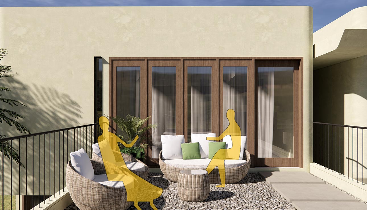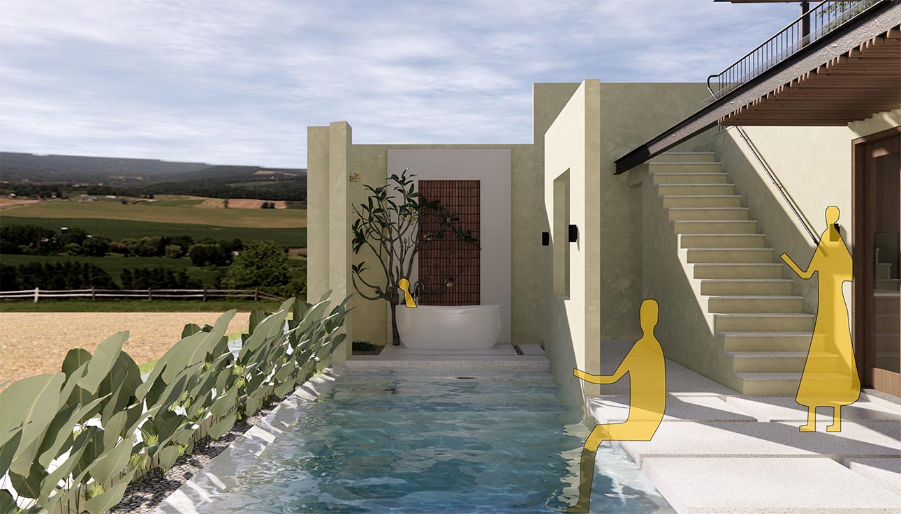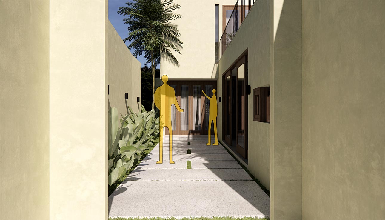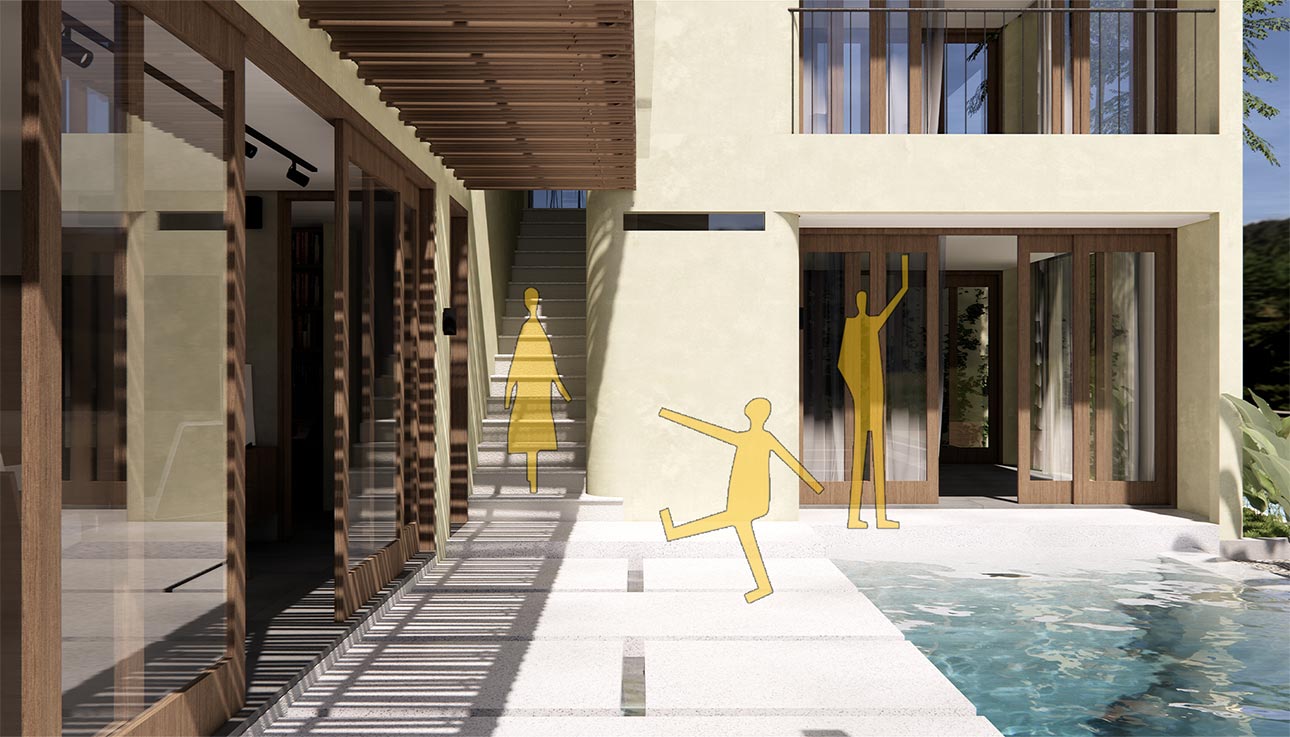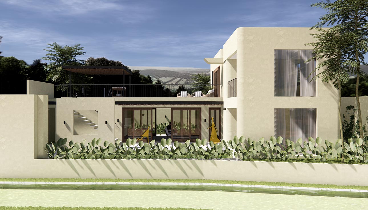 Sebuah villa dengan suasana teduh dan nyaman dirasakan melalui ruang-ruang yang luas dan terbuka, dimana cahaya matahari menyapa lembut melalui bukaan jendela yang besar. Dengan dinding putih yang bersih memberikan sentuhan elegan dan eksotis, menciptakan kontras yang memikat dengan langit biru dan dedaunan hijau sekitarnya. Tanaman tropis yang rimbun dan hijau mengelilingi villa, menciptakan suasana tenang dan hening bagi para pengunjungnya.