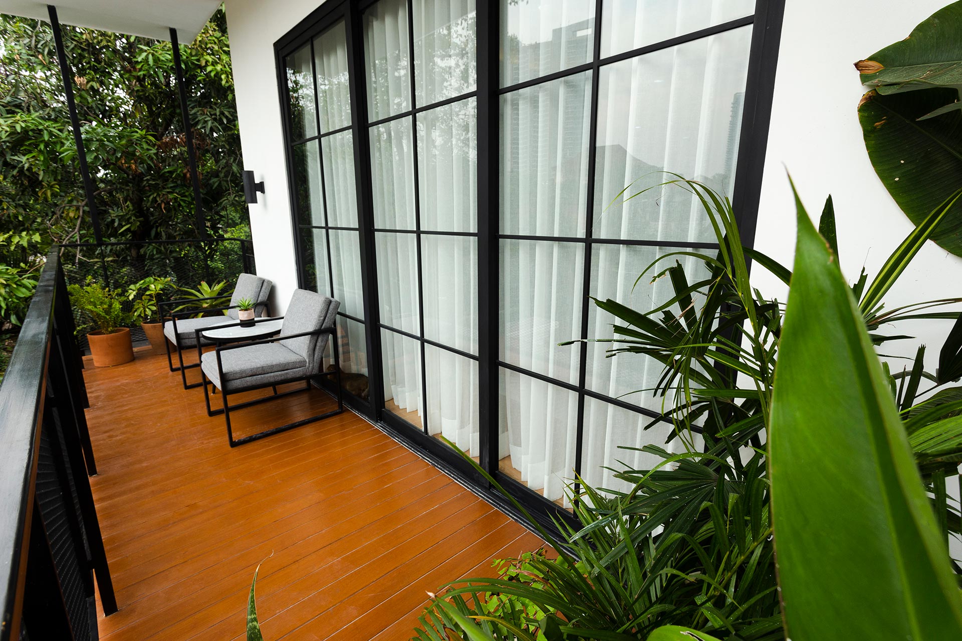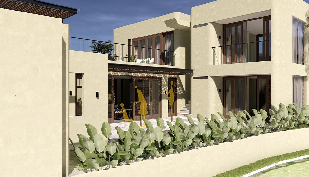 Sebuah villa dengan suasana teduh dan nyaman dirasakan melalui ruang-ruang yang luas dan terbuka, dimana cahaya matahari menyapa lembut melalui bukaan jendela yang besar. Dengan dinding putih yang bersih memberikan sentuhan elegan dan eksotis, menciptakan kontras yang memikat dengan langit biru dan dedaunan hijau sekitarnya. Tanaman tropis yang rimbun dan hijau mengelilingi villa, menciptakan suasana tenang dan hening bagi para pengunjungnya.