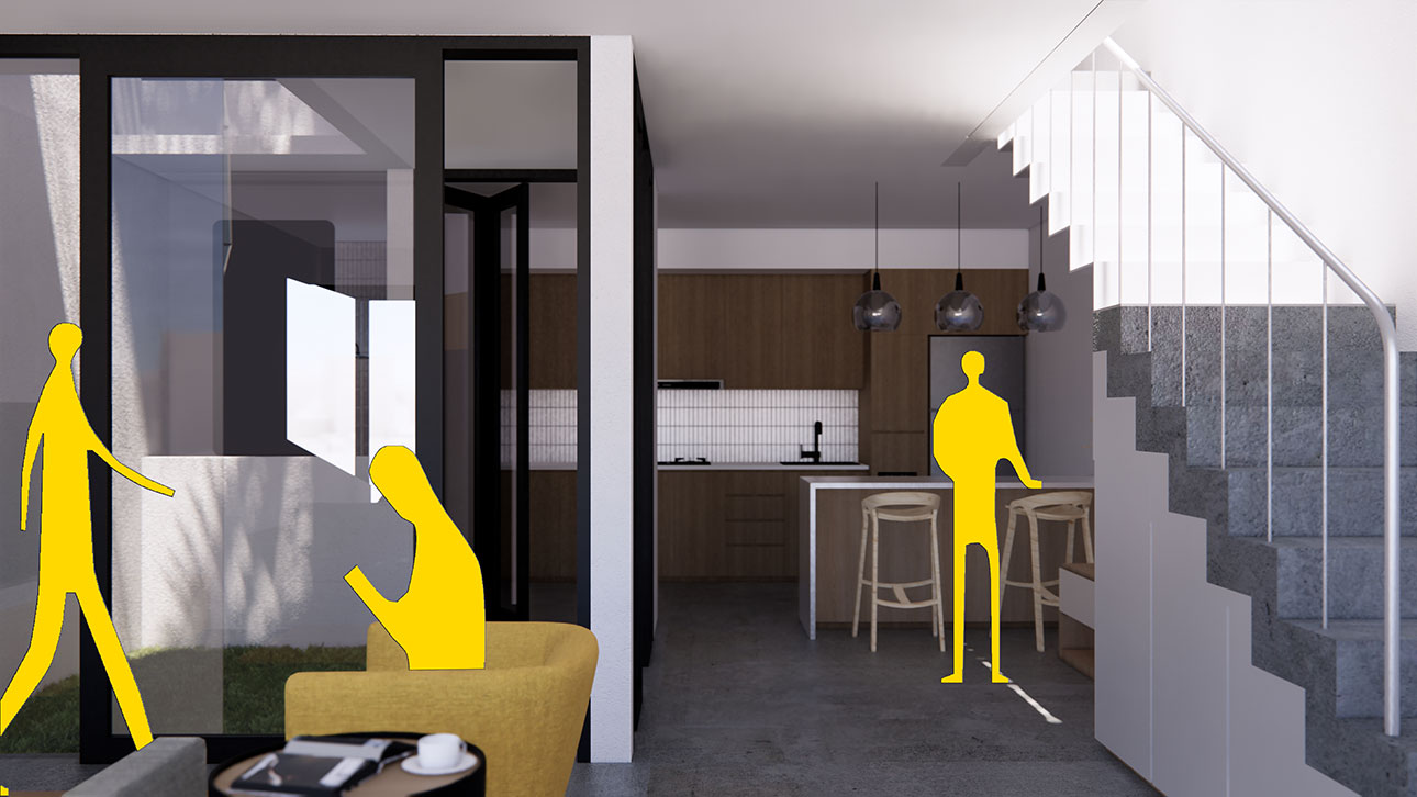 Sebuah rumah 3 lantai dibangun di atas lahan sempit dengan desain minimalis kontemporer. Ruangannya dibuat terbuka dengan sekat minimal dan menggunakan kombinasi warna putih dan kayu untuk kesan hangat. Bangunannya terbagi menjadi dua bagian dengan void tangga, memastikan cahaya alami dan mengurangi konsumsi energi listrik. Terdapat rooftop untuk kegiatan outdoor bersama dengan akses tangga putar untuk menjaga privasi penghuni.